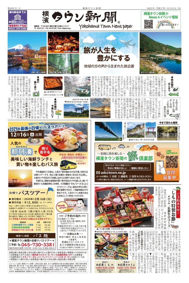 『横濱タウン新聞』は、主に横浜市磯子区・港南区・栄区エリアをメインエリアに発行している地域新聞です。他では珍しくポスティングによる直接投函(約5万部)と同時に、公共施設(磯子区役所・港南区役所・栄区役所等)や商業施設(エリア内郵便局や銀行等)へ設置しています。1985年の創刊以来、40年以上もの間、地域の方々にご愛読いただいております。本紙は「読まれる地域新聞」として、読者の役に立つ情報を紹介し、「役に立った」「新しいことを始めるきっかけになった」「気になっていたお店・サービスを依頼するきっかけになった」と喜んでいただいております。特に30代以上の主婦層から70代、80代までの女性に広く読まれています。横浜南部エリアで活動している企業様、店舗様、団体様と地域の方々との架け橋という重要な役割も担っています。
